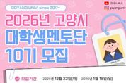 [ 중앙뉴스미디어 ] 고양특례시가 지역 청소년들의 진로 설계를 도울 대학생 멘토단 ‘고양유니브’의 2026년도 신입 단원을 1월 18일까지 모집한다고 밝혔다. 고양형 청소년 진로체험 사업의 대표적인 사업인 ‘고양유니브’는 지역 출신 또는 거주 대학생들이 관내 중고등학생들에게 전공 학과 탐색과 진로 멘토링을 제공하는 프로그램이다. 특히 2026년은 2017년 출범 이후 10년을 맞이하는 해로, 그간의 운영 노하우를 집약해 더욱 내실 있는 프로그램이 운영될 전망이다. 지원 자격은 △고양시 내 중고등학교를 졸업한 대학생 △고양시에 거주 중인 대학생 △고양시 소재 대학교에 재학(또는 휴학) 중인 대학생이라면 누구나 가능하다. 다만, 대학원생은 제외된다. 선발 과정은 지원서의 충실성과 학과 구성의 다양성 등을 종합적으로 심사하여 진행된다. 최종 합격자는 2026년 1월 24일 고양시청소년재단 누리집을 통해 발표될 예정이다. 선발된 멘토들은 청소년들에게 생생한 학과 정보와 진로 상담을 제공하며, 이와 동시에 멘토들 간의 네트워킹 활동과 역량 강화 교육을 통해 개인의 성장 기회도 얻게 된다. 시 관