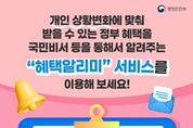 [ 중앙뉴스미디어 ] 개인 상황변화에 맞춰 받을 수 있는 정부 혜택을 국민비서 등을 통해서 알려주는 "혜택알리미" 서비스를 이용해 보세요! · 알림 대상 혜택 행정·공공기관이 제공하는 모든 공공서비스(6,000여종) · 이용 대상 국민 누구나(*만 14세 미만 제외) · 이용 방법 ① 정부24 접속 ② 혜택알리미 가입·이용 *다음 페이지 참고 ■ 혜택알리미 이용 동의 방법 ① 정부24 웹페이지 또는 정부24 어플을 통해 접속해 주세요. ■ 혜택알리미 이용 동의 방법 ② 모바일에선 정부24 하단에 "혜택알림"을 통해 바로 접속 가능해요. ■ 혜택알리미 이용 동의 방법 ③ 동의 후 맞춤 혜택 알림 받기를 클릭해주세요. 본인인증 이후 이용동의를 진행해 주세요. ■ 혜택알리미 이용 동의 방법 ④ 정부24 회원가입 시 혜택알리미 서비스 이용동의를 선택해 주세요. - 혜택알리미 이용약관에 동의하면, 맞춤혜택 알림 등 다양한 서비스를 제공받을 수 있어요! ■ 혜택알리미 이용 동의 방법 ⑤ 회원가입을 위한 회원 정보를 입력하고 간편인증을 진행해 주세요. - 본인인