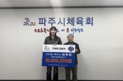 [ 중앙뉴스미디어 ] 파주가 낳은 배구 인기인(스타)이자 아이비케이(IBK)기업은행 알토스 소속 이주아 선수가 고향 후배들을 위해 1천만 원을 기부하며 남다른 고향 사랑을 전했다. 파주시체육회는 지난 23일 체육회 회의실에서 이주아 선수와 부모, 파주시배구협회 관계자(박희수 회장, 황우연 부회장, 전찬혁 사무국장) 등이 참석한 가운데 기부금 전달식을 개최했다. 이번에 전달된 기부금은 파주 지역 생활체육 활성화를 비롯해 유소년 및 학생 선수 육성, 체육 기반 시설 개선 등 파주시 체육 발전을 위한 다양한 사업에 사용될 예정이다. 이주아 선수는 “고향 파주에서 많은 응원과 도움을 받으며 운동을 시작했고, 덕분에 지금의 자리까지 올 수 있었다”라며, “지역 체육 발전과 후배 선수들에게 작게나마 힘이 되고자 기부를 결심하게 됐다”라고 소감을 밝혔다. 이어 “앞으로도 파주 체육이 더욱 활성화돼 꿈을 키우는 후배들이 더 나은 환경에서 운동할 수 있기를 바란다”라고 덧붙였다. 김종훈 파주시체육회장은 “파주 출신 국가대표 선수로 훌륭하게 성장한 이주아 선수가 고향을 잊지 않고 나눔을 실천해 준 데 대해 깊이 감사