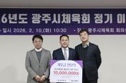 [ 중앙뉴스미디어 ] 광주시에 소재한 ㈜대광레미콘 진성재 대표가 지역 체육 발전을 위해 광주시체육회에 기부금 1천만 원을 전달했다. 기부금 전달식은 지난 10일 광주시 G-스타디움 내 광주시체육회 대회의실에서 열린 2026년 제1차 정기 이사회 중 진행됐으며 체육회 관계자들이 참석한 가운데 이뤄졌다. 이번 기부금은 지역 체육 활성화와 선수 육성, 체육 환경 개선 등 광주시 체육 진흥을 위한 사업에 활용될 예정이다. 진성재 대표는 “지역 체육이 건강하게 성장하는 데 조금이나마 보탬이 되길 바란다”며 “앞으로도 지역 사회와 함께하는 나눔과 상생을 지속적으로 실천해 나가겠다”고 말했다. 이에 대해 박범식 광주시체육회장은 “지역 체육 발전을 위해 따뜻한 나눔을 실천해 주신 진성재 대표와 ㈜대광레미콘에 감사드린다”며 “기부의 뜻이 현장에서 실질적인 성과로 이어질 수 있도록 책임감 있게 활용하겠다”고 밝혔다. 한편, 광주시체육회는 앞으로 민관 협력을 통해 지역 체육 기반을 강화하고 시민 누구나 체육 활동에 참여할 수 있는 환경 조성에 주력할 방침이다.