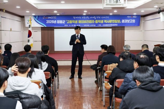 보고회는 한국농어촌공사 장흥지사의 인재육성 장학금 기탁을 시작으로, 중학생 해외문화탐방 결과 발표와 고등학생 해외비전캠프 성과 보고, 학생 소감 발표가 이어졌다.