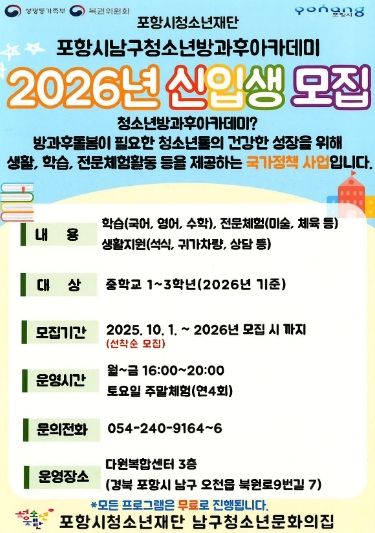 [ 중앙뉴스미디어 ] 포항시청소년재단 남구 청소년방과후아카데미는 오는 31일까지 2026년 신입생을 모집한다.