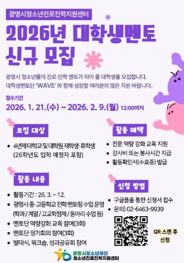 [ 중앙뉴스미디어 ] 광명시청소년재단 청소년진로진학지원센터는 관내 중·고등학교 청소년 대상 학과 멘토링 운영을 위해 ‘2026년 대학생 멘토단(wave)’을 모집한다고 밝혔다.