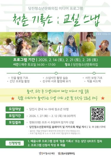 [ 중앙뉴스미디어 ] (재)당진시청소년재단 당진청소년문화의집(관장 유수민)은 오는 2월 14일부터 28일까지 매주 토요일, 14시부터 17시까지 관내 14~19세 청소년을 대상으로 미디어 프로그램 [청춘 기록소 : 교실 스냅]을 운영할 예정이다.