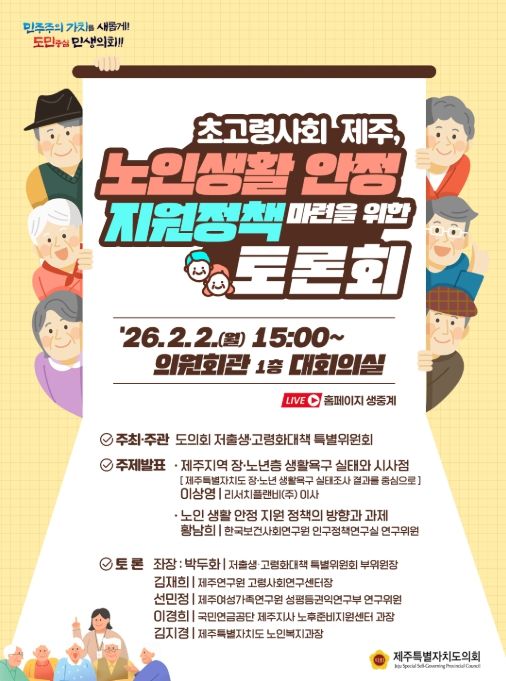 [ 중앙뉴스미디어 ] 2일 제주도의회 대회의실에서 제주특별자치도의회 저출생‧고령화대책 특별위원회 주최‧주관으로 ‘노인 생활 안정 지원 정책 방향’ 정책토론회가 열린다.