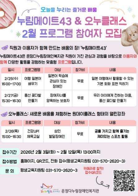 [ 중앙뉴스미디어 ] 파주시 운정다누림장애인복지관은 참여형 평생학습 프로그램 ‘누림메이트43’을 운영하며, 정규 강좌로는 담기 어려운 소규모 학습 수요를 반영한 생활 밀착형 배움을 실천하고 있다.