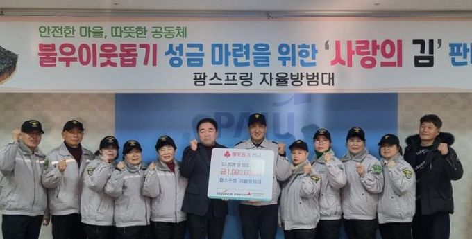 팜스프링 자율방범대는 지난 1월 30일 금촌3동 행정복지센터를 방문해 현금 100만 원을 전달했다. 이번 기탁금은 자율방범대원들이 직접 발로 뛰며 진행한 ‘사랑의 김 판매’수익금으로 마련되어 그 의미를 더했다.