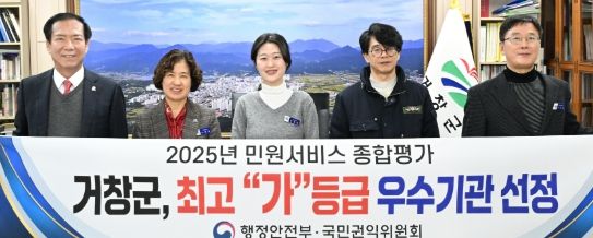 [ 중앙뉴스미디어 ] 거창군은 국민권익위원회·행정안전부 공동 주관한 ‘2025년 민원 서비스 종합평가’에서 최고 등급인 ‘가등급’에 선정돼 전국 최고 수준의 민원 서비스를 인정받았다.