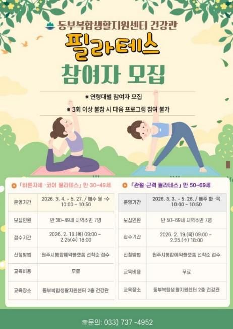 바른자세·코어 필라테스는 3월 4일부터 5월 27일까지 매주 월·수요일에, 관절·근력 필라테스는 3월 3일부터 5월 26일까지 매주 화·목요일에 총 24회에 걸쳐 진행된다. 각 과정은 해당일 오전 10시부터 50분간 센터 2층 건강관에서 소규모 인원으로 운영되며, 수강료는 무료다.