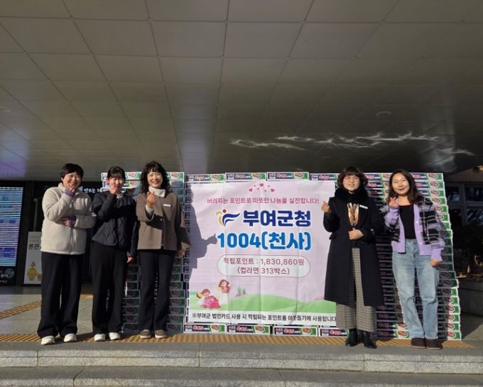 부여군청 관계자는 “버려지는 적립포인트를 모아 이웃사랑을 실천하는 ‘1004 나눔’ 사업이 더욱 확산할 수 있도록 전 부서에 지속적으로 홍보하고, 군민이 체감할 수 있는 복지 실현에 앞장서겠다.”라고 밝혔다.