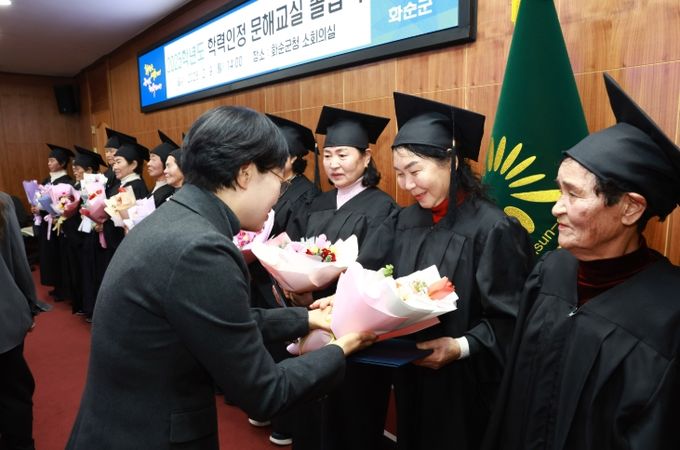 이번 졸업식은 졸업생과 지도강사, 화순군 학력인정 문해교실 강사 등 20여 명이 참석한 가운데 성인문해교육 초등학력인정 교육과정을 이수한 졸업생 13명의 노력과 성취를 공식적으로 인정하고 축하하기 위해 마련됐다.