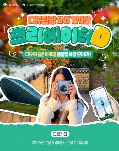 [ 중앙뉴스미디어 ] 대구광역시와 대구문화예술진흥원은 대구 관광의 매력을 발굴하고, 확산할 대구관광 크리에이터D를 다가오는 22일까지 모집한다.