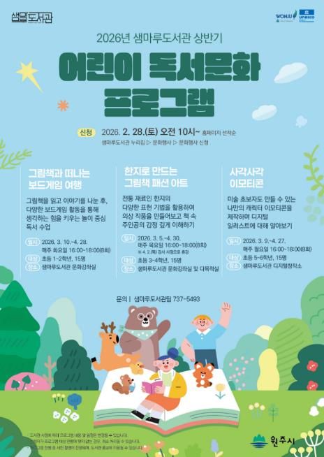[ 중앙뉴스미디어 ] 원주시 샘마루도서관은 오는 3월과 4월, 관내 어린이를 대상으로 ‘상반기 어린이 독서문화 프로그램’을 운영한다.