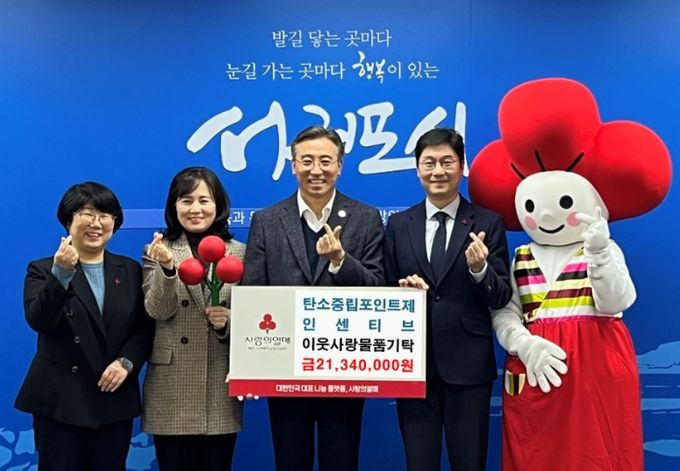 [ 중앙뉴스미디어 ] 서귀포시는 10일 지역 내 어려운 이웃을 위해 2023년도 하반기와 2024년도 상반기 탄소중립포인트제 인센티브 21,340천 원 상당의 상품권을 제주사회복지공동모금회에 지정 기탁했다.
