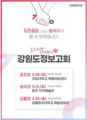 특히, 이번'도정보고회'는 생업으로 바쁜 도민들의 참여를 높이기 위해 주말에 개최되며, 보다 많은 도민과의 소통을 위해 춘천권, 원주권, 강릉권 등 권역별로 순회 개최할 예정이다.