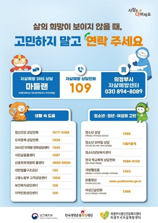 [ 중앙뉴스미디어 ] 의정부시 보건소는 봄철 자살률이 증가하는 자살 고위험 시기(3~5월)를 맞아 시민의 생명을 보호하고 정신 건강 인식을 높이기 위한 자살 예방 집중 홍보 활동을 실시한다.