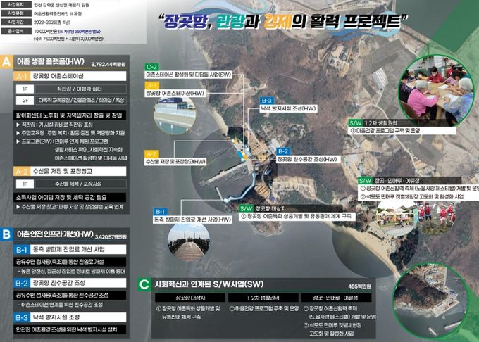 주요 사업 내용으로는 ▲어촌특화 상품 개발 및 유통체계 구축 ▲마을 건강 프로그램 운영 ▲석모도 민머루 갯벌체험장 고도화 ▲장곳항 어촌신활력 축제(노을사랑 페스티벌) 개최 등으로, 주민이 주도하는 어촌경제 기반 조성에 중점을 두고 추진된다.
