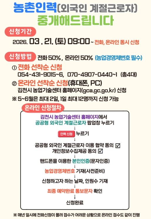 [ 중앙뉴스미디어 ] 김천시가 농번기 인력난 해소를 위해 오는 3월 21일 오전 9시부터 ‘2026년 공공형 외국인 계절근로자’ 신청을 받는다고 밝혔다.