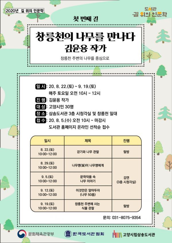 소주제로는 걷기와 나무 관찰 나무맹이 나무맹에게 문학작품 속 나무이야기 나무 50종 알아보기 창릉천 주변에 사는 식물 관찰로 진행된다.