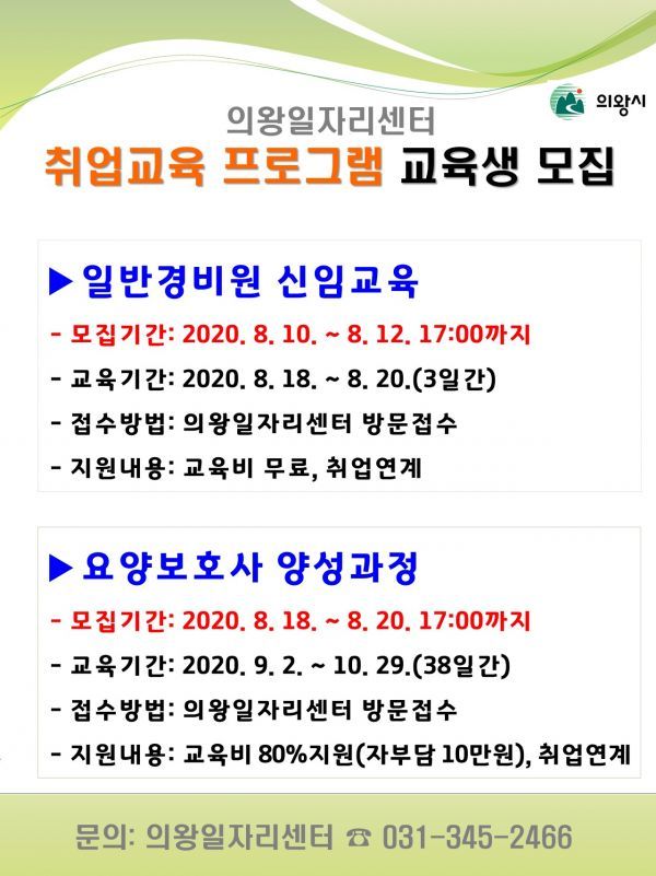 이번 프로그램은 만 65세 이하 의왕시민으로 해당직무로 취업을 희망하는 미취업자는 누구나 신청 가능하며 모집기간 내에 일자리센터에 방문접수하면 되며 모집인원보다 접수인원이 많을 경우 면접을 통해 교육생을 선발할 예정이다.
