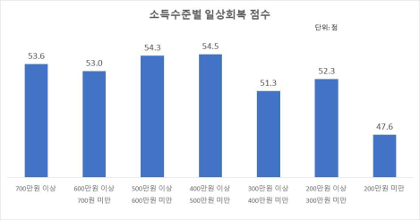 주목할 만한 결과로는 소득수준에 따라 일상회복 수준에 차이가 나타났는데 200만원 미만 집단의 회복 점수는 47.6점으로 700만원 이상의 고소득층 53.6점보다 크게 낮았다.
