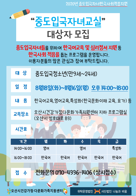 대상은 만 9~24세 중도입국자녀이며 참여 희망자는 오산시건강가정·다문화가족지원센터로 접수하면 된다.