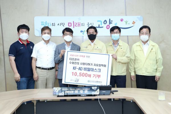 전달식에 참석한 이재준 고양시장은 “비말차단 마스크를 제공해 온정의 손길을 내밀어 준 수와진의 사랑더하기와 ㈜더조은에 감사드린다”며 “코로나19 감염 예방을 위한 방역활동에 최선을 다하겠다”고 말했다.