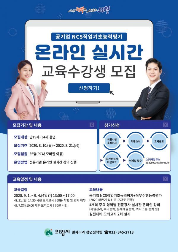 모집인원 35명을 선착순으로 모집하며 만 19세 이상 34세 이하 청년이면 누구나 8월 10일부터 21일까지 의왕시청 홈페이지 고시공고 게시판에 게시된 참가신청서를 다운받아 작성 후 담당자 이메일로 제출하면 된다.