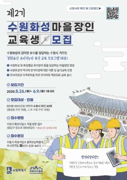 [ 중앙뉴스미디어 ] 수원시가 6월 9일까지 ‘제2기 수원화성 마을장인’ 교육생 30명을 모집한다.
