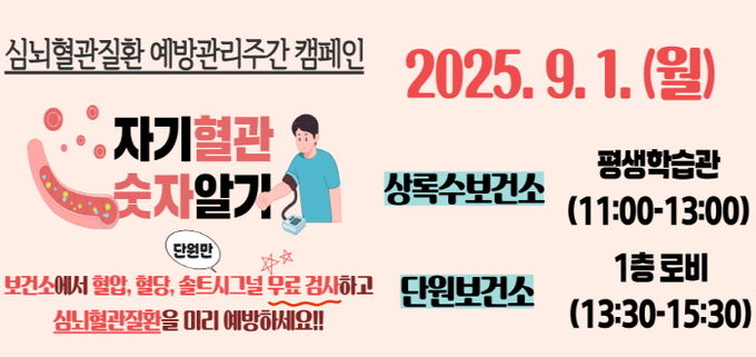 정영란 단원보건소장은 “이번 캠페인을 통해 시민들이 자신의 혈관 건강을 직접 확인하고, 건강한 생활 습관을 실천하는 계기가 될 것”이라며, “정기적인 혈압·혈당 확인과 생활 습관을 통해 심뇌혈관질환을 예방할 수 있길 기대한다”고 말했다.