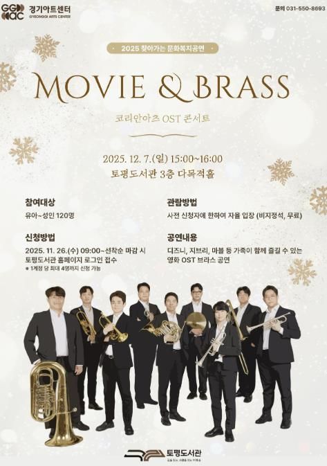 'Movie & Brass'는 오는 12월 7일(일) 오후 3시, 토평도서관 3층 다목적홀에서 브라스 앙상블 ‘코리안아츠(Korean Arts)’가 선보이는 영화 OST 콘서트로 진행된다.
