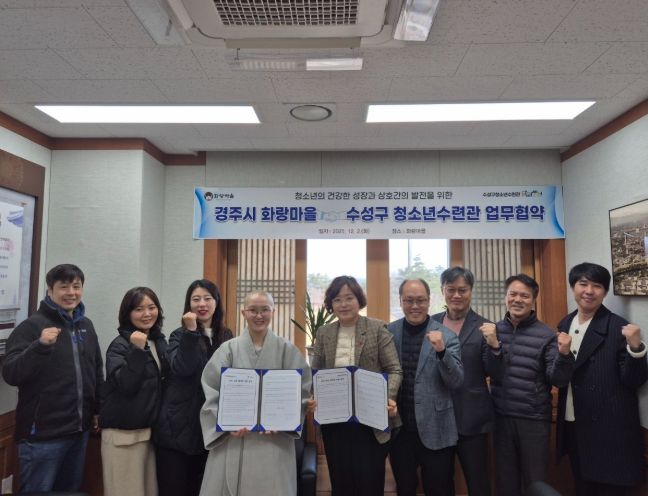 [ 중앙뉴스미디어 ] 경주시 청소년수련시설 화랑마을과 대구 수성구 청소년수련관은 지난 2일 화랑마을에서 청소년 활동 발전과 상호 협력 강화를 위한 업무협약을 체결했다.