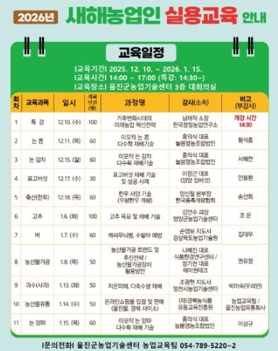 [ 중앙뉴스미디어 ] 울진군은 오는 12월 10일부터 2026년 1월 15일까지 총 11회에 걸쳐 ‘2026년 새해농업인실용교육’을 운영한다.