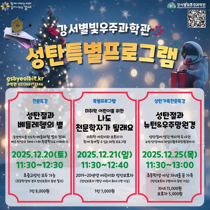 [ 중앙뉴스미디어 ] 서울 강서구 강서별빛우주과학관(금낭화로 178)은 연말과 성탄절을 맞아 다채로운 천문 프로그램을 운영한다.