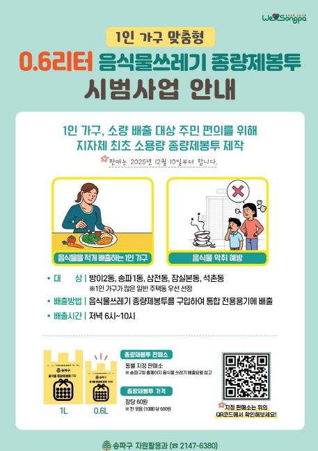 [ 중앙뉴스미디어 ] 서울 송파구가 전국 지방자치단체 최초로 1인 가구에 최적화된 0.6ℓ 규격의 음식물쓰레기 종량제봉투를 오는 10일부터 시범 도입해 운영한다고 알렸다.