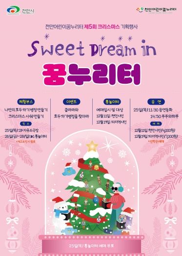 [ 중앙뉴스미디어 ] 천안어린이꿈누리터(관장 조삼혁)는 오는 12월 25일부터 28일까지 제5회 크리스마스 기획행사‘Sweet Dream in 꿈누리터’를 진행한다고 밝혔다.