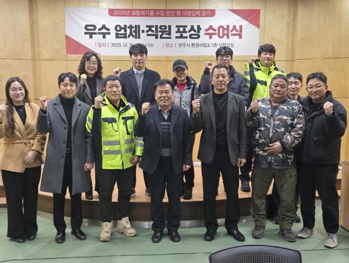 [ 중앙뉴스미디어 ] 원주시는 12월 16일 '2025년 생활폐기물 수집ㆍ운반 대행업체 평가결과'에 따른 우수등급 업체 및 소속 직원을 대상으로 원주시장 상장 및 표창장을 수여한다.