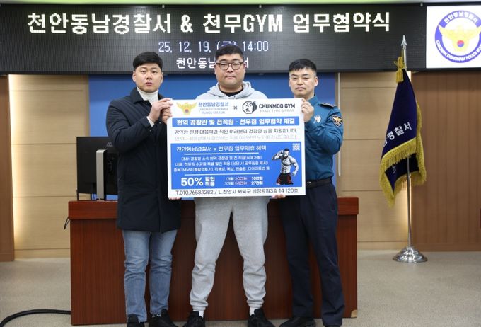 [ 중앙뉴스미디어 ] 천안 동남경찰서(서장 송해영)는 2025년 12월 19일(금) 오후 2시, 천안동남경찰서 중회의실에서 무에타이·MMA 전문 체육관인 ‘천무짐’(관장 문보람)과 ‘경찰관 체력 증진 및 복지 향상’을 위한 업무협약(MOU)을 체결했다고 밝혔다.