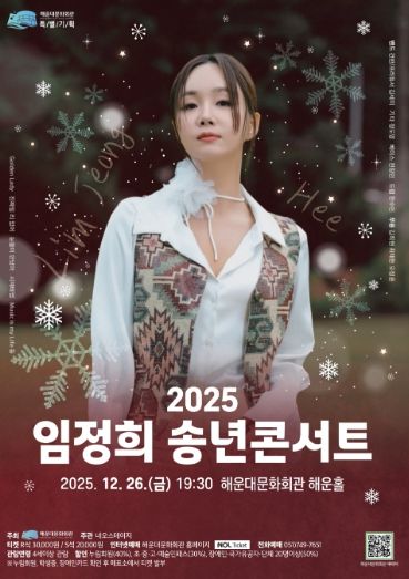 [ 중앙뉴스미디어 ] 해운대문화회관은 오는 12월 26일 오후 7시 30분, 해운대문화회관 해운홀에서 송년 특별기획 공연인 ‘2025 임정희 송년콘서트’를 개최한다.