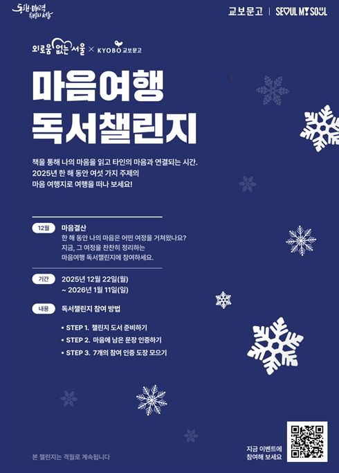 [ 중앙뉴스미디어 ] 서울시가 ‘외로움 없는 서울’을 만들기 위한 노력의 일환으로 교보문고와 함께 여섯 번째 ‘마음여행 독서챌린지’를 진행한다. 이번 챌린지는 ‘마음결산’을 주제로, 올해 나의 마음을 움직인 책과 그 속에서 기억에 남는 문장을 선택해 ‘2025 마음결산 리포트’를 완성하며 한 해의 여정을 마무리한다.