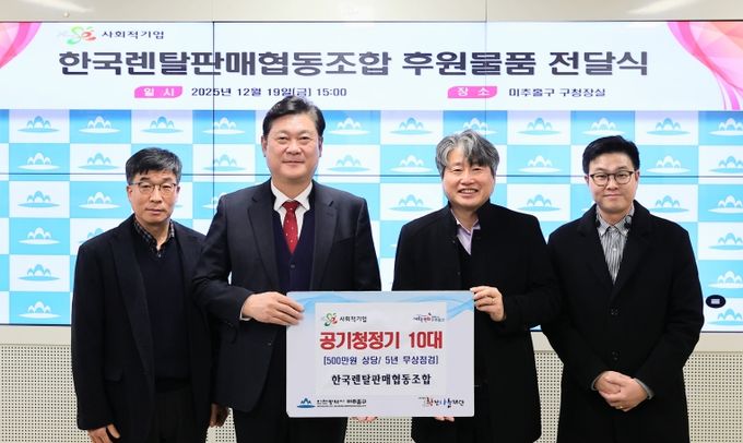 [ 중앙뉴스미디어 ] 인천 미추홀구는 지난 19일 사회적기업 한국렌탈판매협동조합(대표 정영이)으로부터 공기청정기 10대를 전달받았다.