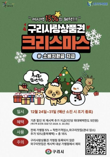 [ 중앙뉴스미디어 ] 구리시는 12월 24일부터 ‘구리사랑상품권 크리스마스 소비 지원금’을 지급한다고 밝혔다. 이번 소비 지원금은 연말연시 기간 지역 외로 유출되는 소비를 지역 내로 유도하고, 관내 상권 활성화와 소상공인 보호를 위해 마련됐으며, 예산 소진 시 조기 종료될 수 있다.