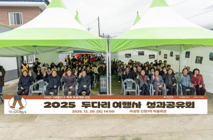 [ 중앙뉴스미디어 ] 문경시 마성면 신현1리 주민회는 지난 20일 마을회관에서 사업 참여자와 신현1리 마을주민 등 100여 명이 참석한 가운데 2025년 1시군-1생활인구 특화 프로젝트의 일환으로 추진된 지역살이 프로그램‘두다리 여행사’ 성과공유회를 가졌다.