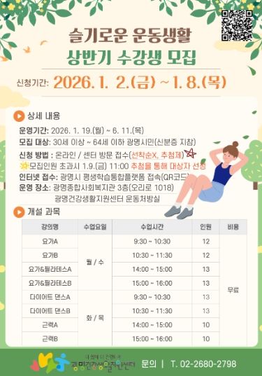 [ 중앙뉴스미디어 ] 광명시 광명건강생활지원센터는 새해를 맞아 시민들의 건강한 생활습관 형성과 만성질환 예방을 위해 2026년 상반기 ‘슬기로운 운동생활’ 운동 프로그램 참여자를 모집한다.