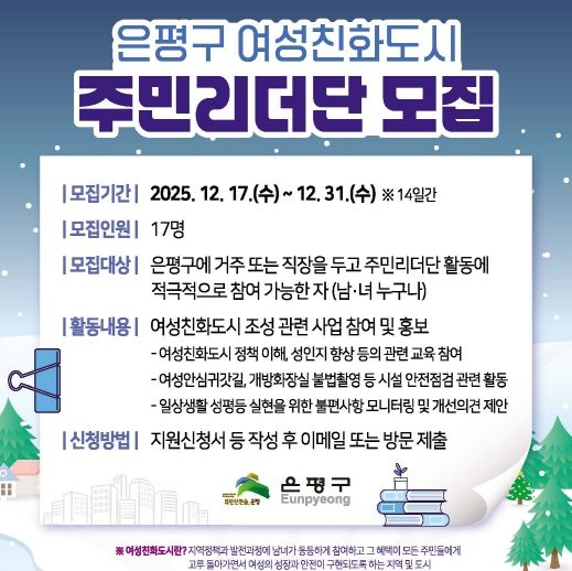 모집 기간은 31일까지로, 온라인 또는 방문 접수가 가능하며 은평구에 거주하거나 직장을 둔 주민 중 주민리더단 활동에 적극적으로 참여할 수 있는 자는 누구나 지원할 수 있다.