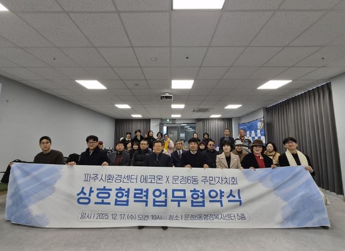 [ 중앙뉴스미디어 ] 운정6동 주민자치회는 12월 17일 오전 10시, 운정6동 행정복지센터에서 파주시환경센터 ‘에코온’과 ‘지역 환경 의제 실천 및 기후행동 협력을 위한 업무협약’을 체결하고, 이어 마을 소식지 '초롱꽃향기로' 2호 제작 성과공유회를 개최했다.