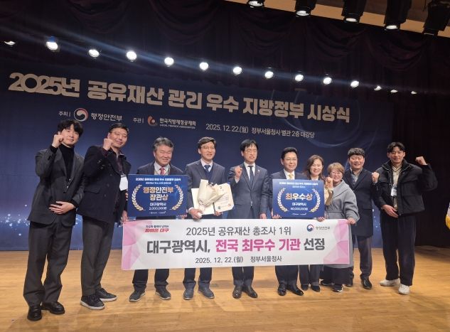 [ 중앙뉴스미디어 ] 대구광역시는 12월 22일 행정안전부 주최 ‘2025년 공유재산 우수 지방자치단체 시상식’에서 공유재산 총조사 부문 최우수 기관 선정과 더불어, 공유재산 우수사례 경진대회에서 우수상(장관상)을 수상하는 등 공유재산 관리와 활용 분야에서 최고 수준의 역량을 입증했다.