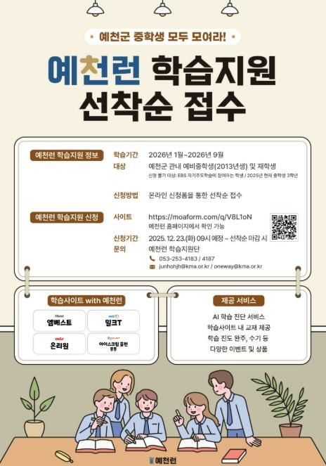 [ 중앙뉴스미디어 ] 예천군은 지역 청소년의 학습격차 해소와 자기주도학습 역량 강화를 위해 추진 중인 AI 기반 학습지원 사업 ‘예천런’에 참여할 예비 중학교 1학년 및 재학생을 추가 모집한다.