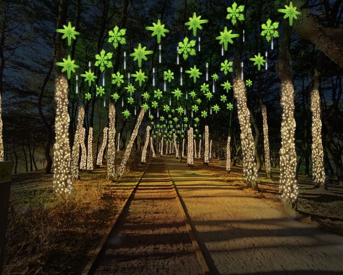 천년숲 산책로에는 은하수 조명과 녹색 별·눈 결정 오브제, 눈이 내리는 듯한 스노우폴 조명 등 총 640개의 경관조명이 설치되며, 특히 스노우풀 조명은 20초 간격으로 점멸되도록 연출돼, 고요한 숲길에 리듬감을 더한다.