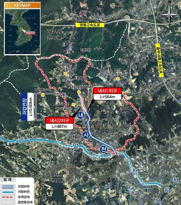 정비사업은 여주시 흥천면 내사리 일원 총 연장 0.6km 구간의 하천을 정비(하폭 6~14 → 15~20m)하는 것으로 ▲축제공(제방 쌓기) 1.05km ▲교량 3개 설치 등이 포함된다.